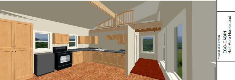 Here is a computer-generated image of the interior of the eco-cabin from my architect. This is part of the plans.