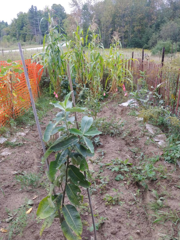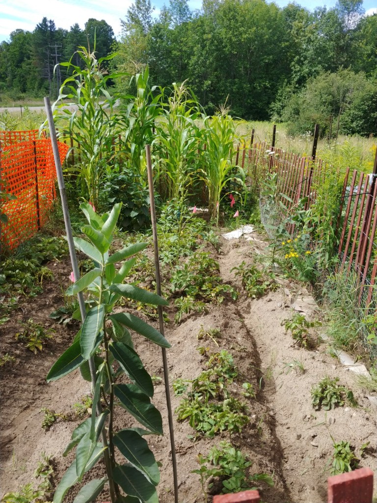 For fun, here’s a photo around one month later: potatoes have died back, Corn is nice and high, although I would have preferred it was all one height. I think this was because of shading from the high meadow plants combined with the fence.