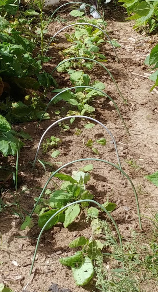 This year, I dedicated a special area for them. I am growing the “York” variety, which has been an award winner at our major fall fair. As well, it is pretty disease resistant. In this photo, I have thinned out the first section of the row, and will finish thinning them out tomorrow. You might be wondering why I have the hoops in place. That is simply to remind me not to step on that late planting area while wandering in the garden! Should I decide to keep these in the ground late, it will also be very easy to throw on a piece of plastic to extend their growing season.