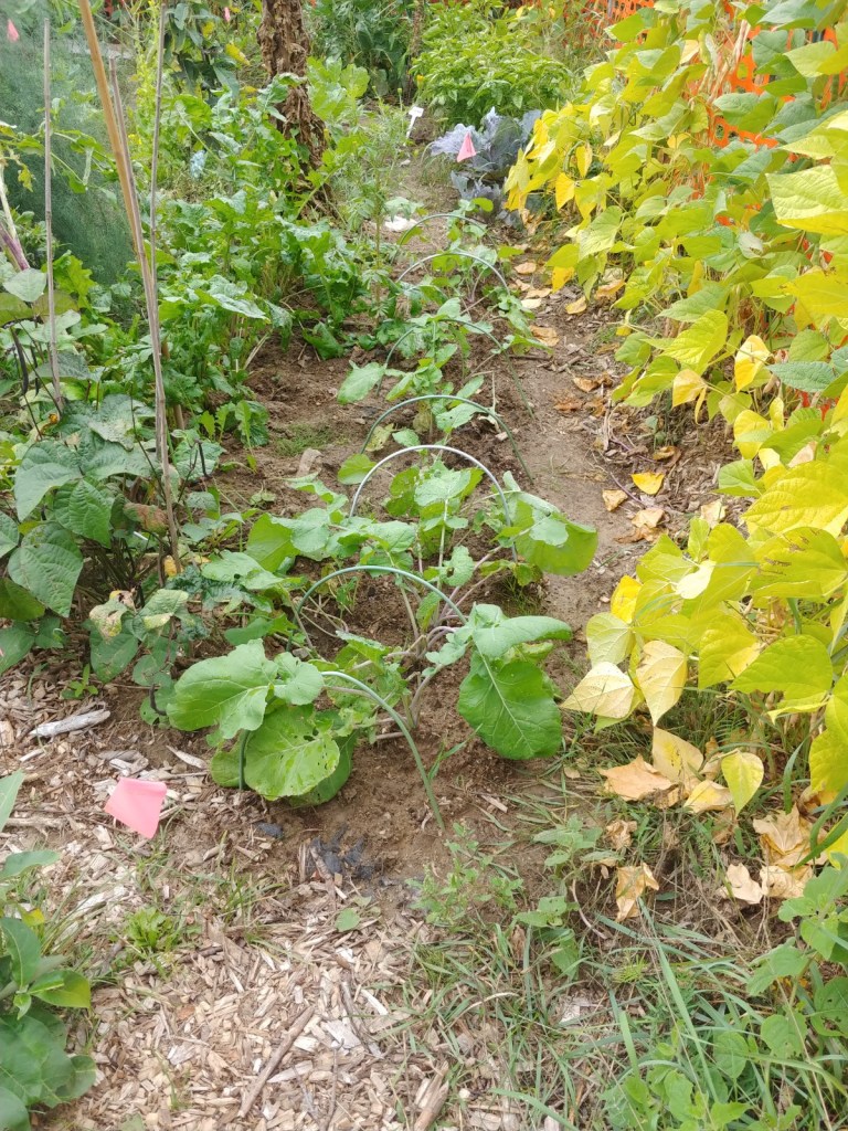 For fun, here are the rutabagas one month later, too. The back has also been thinned. I am excited about the growth, especially of the front plants. This means that I have enough Boron in my soil. On the left you can see my giants turnips still growing. I store them in damp tea towels in perforated bags in the fridge. Stored that way, they last for months. When I need one, I just take it out. I usually oven roast them. On the right, you can see that my beans are basically done. These are pinto beans, so I am growing them for protein. They did very well along the fence this year. I added some extra peat to my sandy soil and mulched the plants once they emerged from the soil.