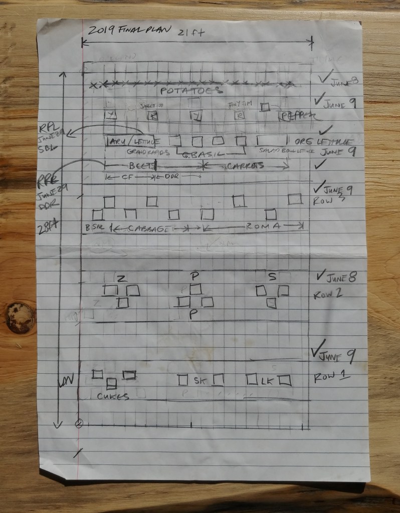 You can see below here my Garden Map from 2019. This is approximately to scale where each square is about 1 square foot. Notice that I recorded the planting date of each row, as well. Here are some of the shortforms I use: Z Zucchini, P Pumpkin, S Squash, BSpr Brussels Sprouts, Y Yellow cherry tom, R red cherry tom, SK Siberian Kale, LK Lacinato Kale. other short forms record the variety of some veggies, like Beets. I will have a future post on my 2022 garden plan, so I’ll leave it at that for the details.