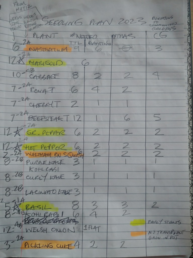 To draw up the summary of my garden plan, I just needed to go to my garden book and find last year’s version. I am adding a couple of new plants, which I will talk about in more detail below. Here is the summary of what I will plant. You will see three main columns: how many I plan to plant for myself, any extras I plan to grow, and how many the community gardens needed last year. Then, the grand total is on the left hand side. I consider the “extras” to be a bit of insurance and always give them to friends and family.