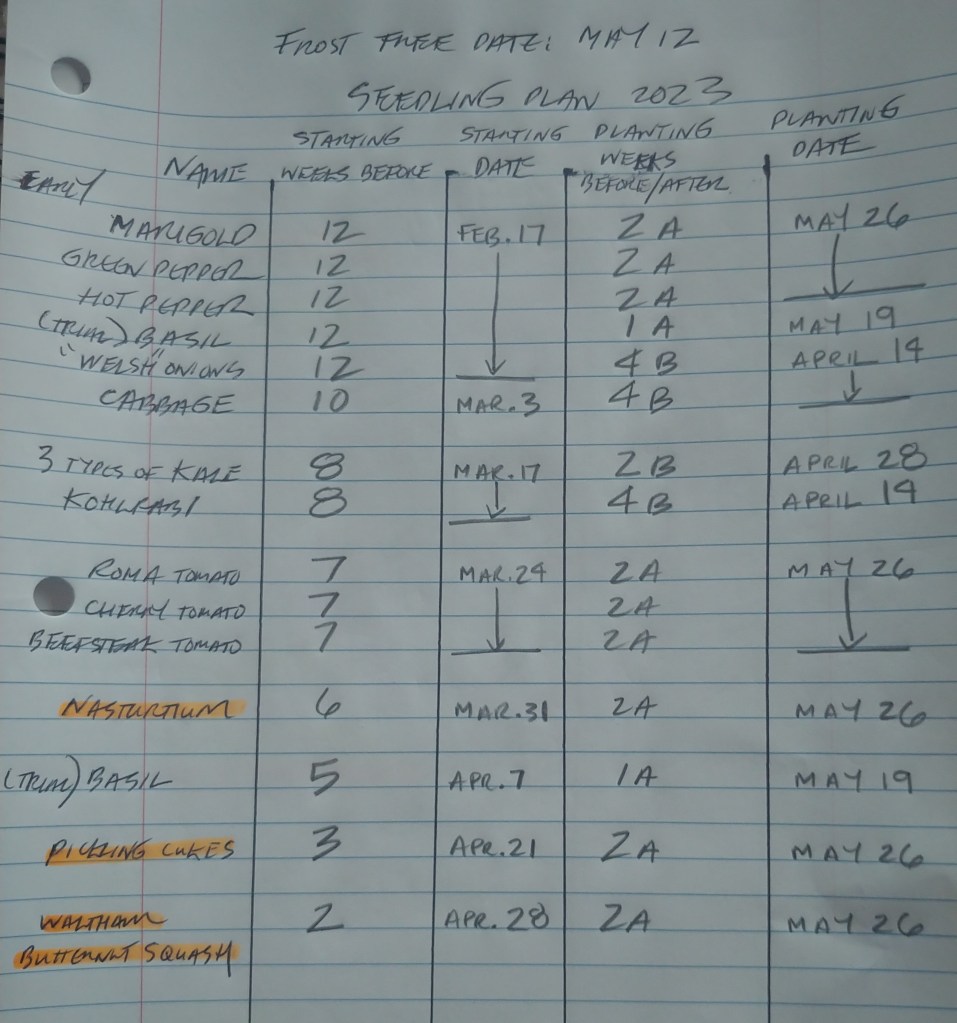 So, I now have a conservative date of May 12 for my last frost date, and a plan to use simple low tunnels on a few of my early plantings. The piece of paper below will show you when I will plant each type of seedling. Due to their differences and preferences, each of these plants may prefer to be planted well AFTER the last frost date, or even quite a bit BEFORE. So, I have recorded all of these and then used the number of weeks and the before/after to identify the actual date on the calendar. I like this plan, as there is some staggering of plantings, with May 26th being the biggest day. Because that is an important planting day, if there is any sign of colder weather, I will delay it a few days.