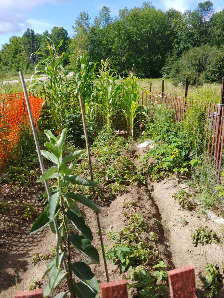 One of the first things I noticed on this land was all of the milkweed plants. I knew that Monarch Butterflies lay their eggs on the milkweed plant. How exciting! I decided to declare this half-acre to be a Monarch Butterfly Sanctuary. In the spirit of this, I allow the milkweed to grow where they like. If there are in my vegetable garden, I don’t remove them. Here is a photo of my second garden bed this August. There are potatoes, there is corn, and there is a large milkweed, which I have staked for support.
