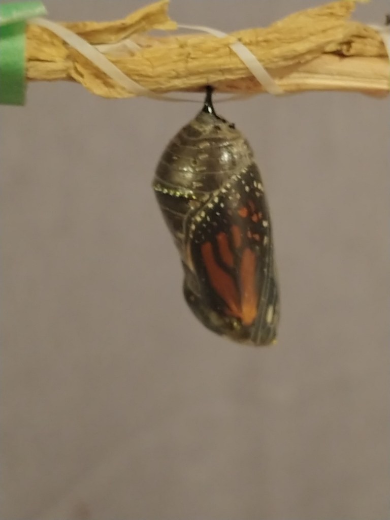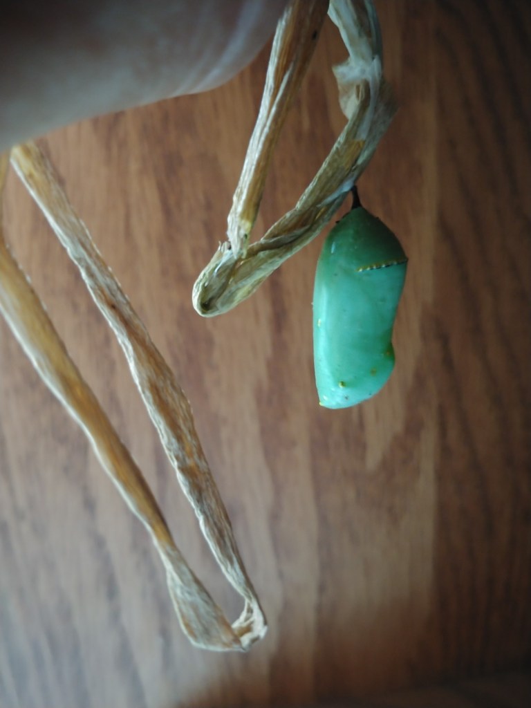 Something about the shape looked familiar. I took it inside and put “green pod gold spots images” into my search engine. Imagine my delight when I realized that I had found a Monarch Butterfly chrysalis! Some quick research on the Monarch life cycle and I realized that this chrysalis needed some help. It had clearly been attached to the onion leaves before they had dried and fallen. If the butterfly had emerged while the chrysalis was on the ground, it would not have survived, as it would not have had the space around it to unfold and properly dry its wings.