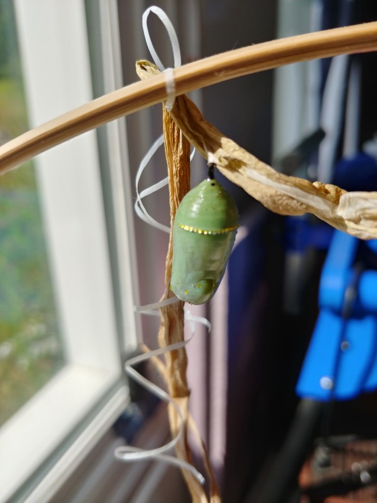 What should I do? I felt needed to do a bit more research on the best place to relocate it back outside. In the meantime, I hung it on a basket handle that was, well, handy. A bit of dental floss worked well to tie it. You can see the gold spots quite nicely in this photo. What is their purpose? They help the developing butterfly to breathe.The spots are gold due to carotenoids that the Monarch caterpillar got from eating the milkweed plant. That is part of the explanation for where the chemicals came from, but it doesn’t explain the magic of how the caterpillar knew to put them there.