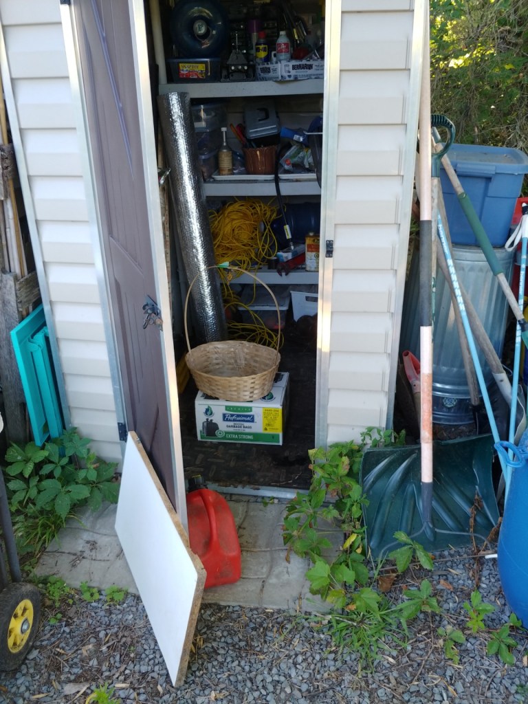 When the chrysalis goes clear, it means that the butterfly is going to emerge very soon. What was I going to do? I hadn’t had time to do my research…It was 4:30am in the morning and I had to be at work. There was rain in the forecast….I made the quick decision to place the basket in one of my sheds….There was no time to attach the chrysalis to anything else….I adjusted the dental floss to ensure that the emerging butterfly would have enough clearance on all sides to dry and unfold its wings. I propped the door open with a gas can and wished the chrysalis the best, heading off into the dark to work. When I returned several hours later….I went to the shed right away. What had happened? Can you guess?