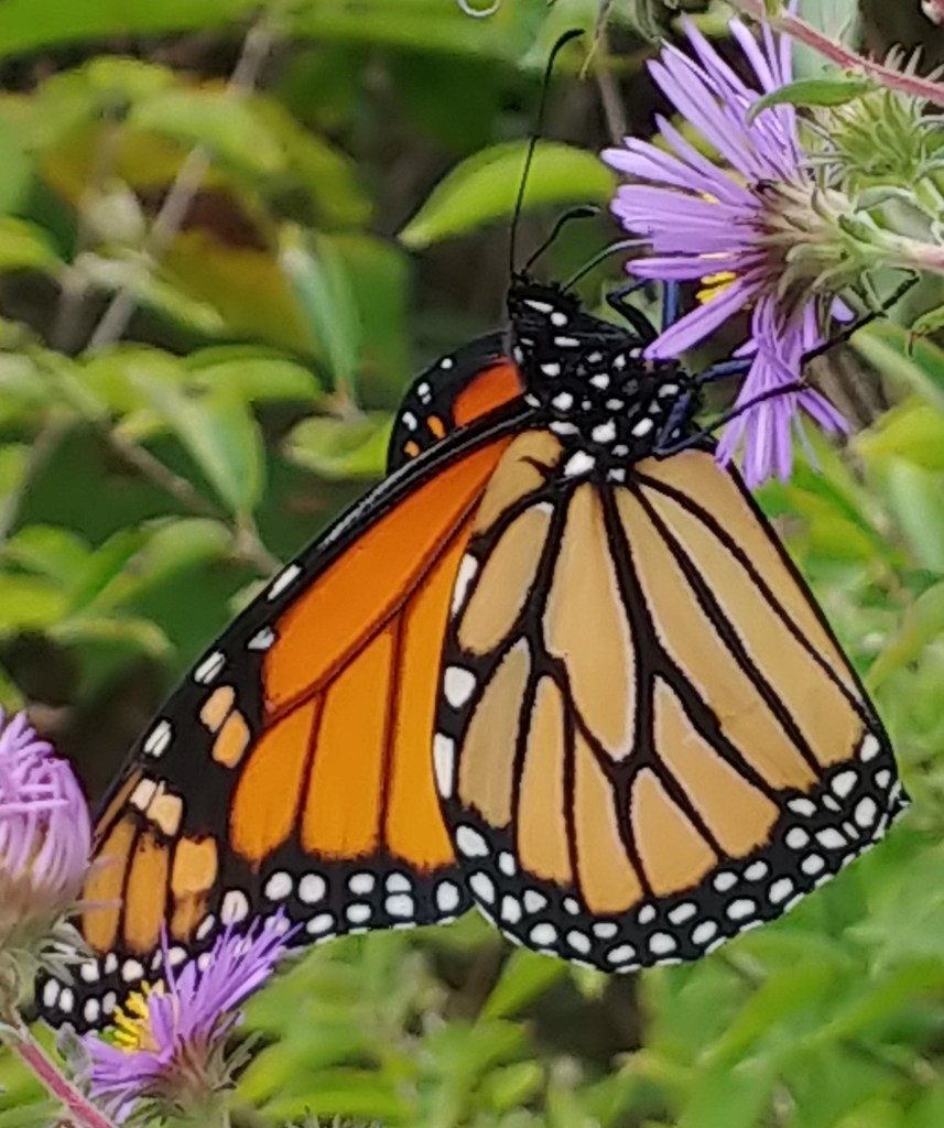 I found it interesting that you can really see the outlines of the wings on it now. The gold spots that had originally caught my eye in the sand were still there, too. Only a couple of days later, I saw a Monarch butterfly on a New England Aster. I could tell it was a female. Could it be my new friend? Have a look at this photo. What do you think?