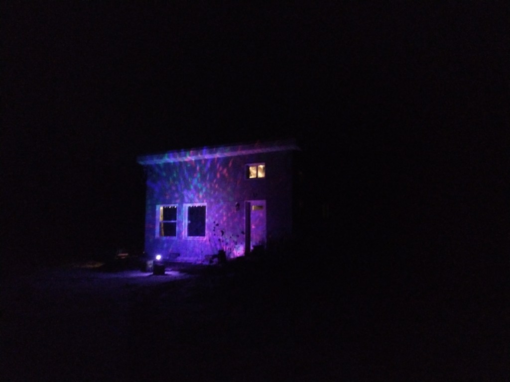 Especially in the past several years, I have come to love the quiet of winter for reflecting and writing. Here’s a photo of the eco-cabin bathed in my holiday kaleidoscope lights.